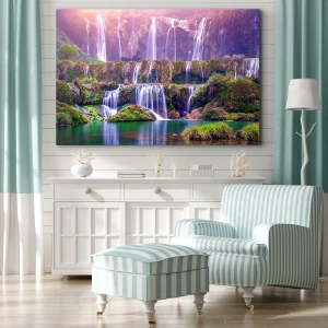 Die zarte pastellfarbene Beleuchtung verleiht der Szene einen magischen und entspannenden Charakter und betont die Schönheit natürlicher Details wie der Wasserkaskaden und der Vegetation, die den Wasserfall umgibt. Das Werk strahlt Ruhe und Ausgeglichenheit aus und ist daher die ideale Wahl für Innenräume, die inspirieren und beruhigen sollen.