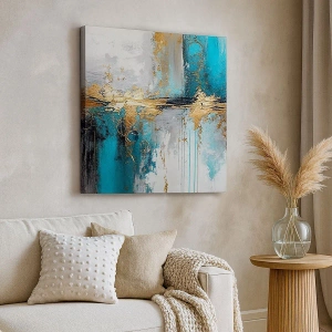 - Dieser 70 x 50 cm große Leinwanddruck zeigt eine abstrakte Komposition in Türkis- und Goldtönen. Eine perfekte Ergänzung für moderne und elegante Innenräume.