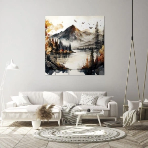 • Dieser 70x50 cm große Leinwanddruck zeigt eine herbstliche Berglandschaft mit einem See und bunten Bäumen. Er ist die perfekte Wahl für Naturliebhaber und alle, die ruhige Innenräume lieben.