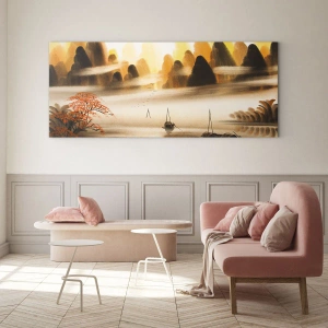 Glasbild - Bild auf glas - Orientalische Landschaft mit Booten und Bergen im Nebel - 70x50cm - Weiter als im Fernosten - Moderne Wanddekoration für Wohnzimmer und Schlafzimmer ARTTOR