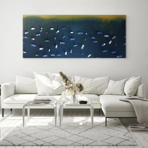 Die Szene ist detailreich – jedes Boot wirkt anders und bildet ein dynamisches und doch harmonisches Ganzes. Wie Puzzleteile vor einem blauen Hintergrund verstreut, erzeugen die Boote in verschiedenen Farben – Rot, Blau, Grün und Weiß – einen malerischen Effekt. Die Vogelperspektive verleiht dem Bild Originalität und zieht den Blick auf sich. Der goldene Sand und das intensiv blaue Wasser bilden einen Kontrast und schaffen eine faszinierende Landschaft, die dem Interieur einen Hauch von Exotik verleiht.