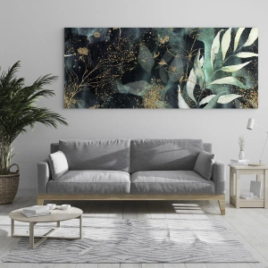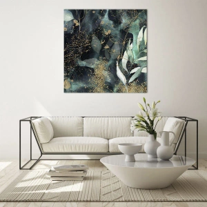 Glasbild - Bild auf glas - Gold- und Grünblätter auf dunklem Hintergrund - 50x70cm - Zaubergarten - Moderne Wanddekoration für Wohnzimmer und Schlafzimmer ARTTOR