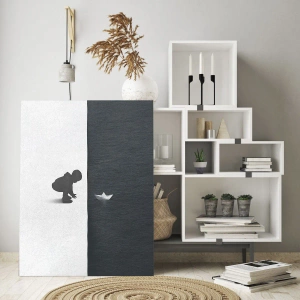 • Eine minimalistische Szene, in der ein Kind ein Papierboot ins Wasser wirft. Ein symbolisches Bild für Träume, Abenteuer und kindliche Neugier. Perfekt für ruhige, besinnliche Innenräume.