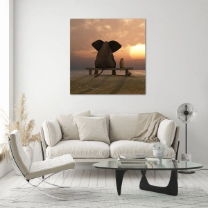 Glasbild - Bild auf glas - Elefant und Hund auf einer Bank bei Sonnenuntergang - 50x70cm - Es tut gut zusammen zu schweigen - Moderne Wanddekoration für Wohnzimmer und Schlafzimmer ARTTOR