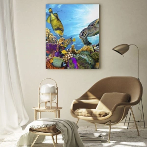 Glasbild - Bild auf glas - Unterwasserszene mit Schildkröten, Fischen und Korallen - 70x50cm - Korallenpromenade - Moderne Wanddekoration für Wohnzimmer und Schlafzimmer ARTTOR