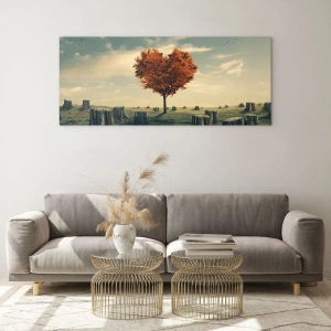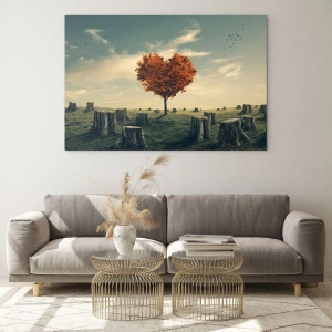 Glasbild - Bild auf glas - Ein herzförmiger Baum, umgeben von abgesägten Stämmen auf einer Lichtung - 70x50cm - Es gibt noch Hoffnung - Moderne Wanddekoration für Wohnzimmer und Schlafzimmer ARTTOR