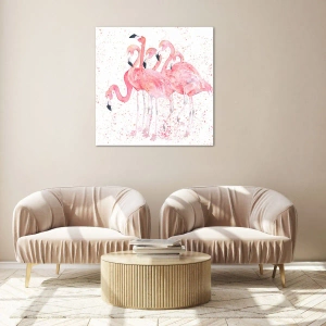 Verleihen Sie Ihrem Interieur mit dem Glasbild „Pink Ensemble“ subtile Eleganz. Es zeigt wunderschöne Flamingos im Aquarellstil auf hellem Hintergrund mit zarten Punkten und schafft so eine Komposition, die durch ihre Leichtigkeit und Raffinesse begeistert.