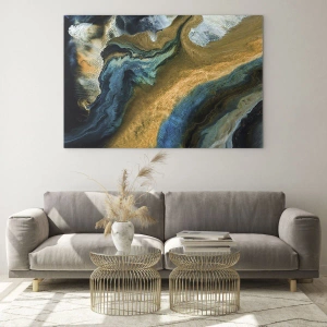 - Eine faszinierende Abstraktion mit dominanten Gold- und Blautönen, die strukturelle Farbübergänge und elegante Tiefe kombiniert. Eine perfekte Dekoration für moderne und minimalistische Innenräume.