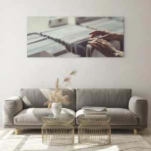 Das auf Glas gemalte Gemälde hebt die Details der Schallplatten und die Wärme ihrer Oberflächen hervor und verleiht dem Interieur eine nostalgische Atmosphäre. „Auf der Suche nach Emotionen“ ist ein Werk, das nicht nur einen Raum schmückt, sondern auch Wärme und Erinnerungen an vergangene Jahre weckt.