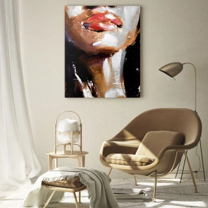 Das Gemälde „Stolz ohne Vorurteile“ ist ein ausdrucksstarkes Nahaufnahmeporträt einer Frau, das sich auf den unteren Teil des Gesichts, den Hals und einen Teil der Schultern konzentriert. Die Komposition ist voller Intensität und Energie und wird von starken Farbkontrasten dominiert – gesättigte rote Lippen, braune Haut und das Weiß und Schwarz der Umgebung. Die Pinselstriche sind klar, dick, fast dreidimensional und verleihen dem Gemälde eine einzigartige Textur und Tiefe.
