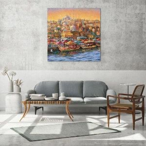 Glasbild - Bild auf glas - Ein farbenfroher Hafen mit Booten und einem Stadtpanorama bei Sonnenuntergang - 50x70cm - Istanbuler Geschichte - Moderne Wanddekoration für Wohnzimmer und Schlafzimmer ARTTOR
