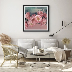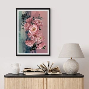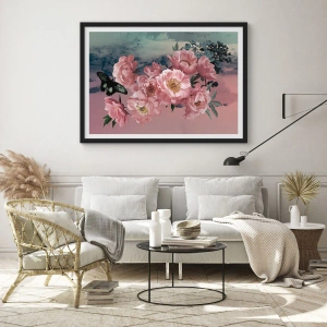 Poster in einem schwarzem Rahmen - Rosa Pfingstrosen mit einem Schmetterling auf pastellfarbenem Hintergrund - 70x50cm - Der Höhepunkt der Romantik - Moderne Wanddekoration für Wohnzimmer und Schlafzimmer ARTTOR