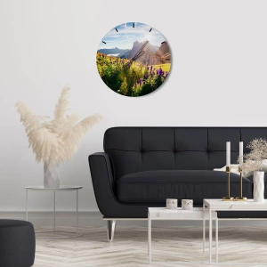 • Diese runde Wanduhr im Format 30 x 30 cm zeigt violette Blumen auf einer sonnenbeschienenen Bergwiese. Perfekt für Innenräume, die von Natur und Harmonie inspiriert sind.