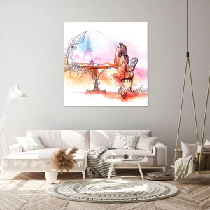 Bild auf Leinwand - Leinwandbild - Romantisches Aquarell einer Frau in einem Café mit Blick auf einen Turm - 50x70cm - Pariser Chic - Moderne Wanddekoration für Wohnzimmer und Schlafzimmer ARTTOR