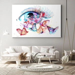 Bild auf Leinwand - Leinwandbild - Ein Aquarellauge, umgeben von bunten Schmetterlingen - 50x70cm - Märchenhafter Augenzauber - Moderne Wanddekoration für Wohnzimmer und Schlafzimmer ARTTOR