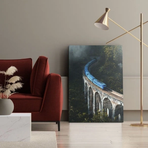 Bild auf Leinwand - Leinwandbild - Ein blauer Zug auf einem historischen Viadukt inmitten der Wälder - 50x70cm - Neigung zur Natur - Moderne Wanddekoration für Wohnzimmer und Schlafzimmer ARTTOR