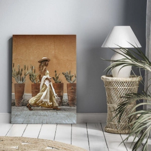 • Dieser 50x70 cm große Leinwanddruck zeigt eine Frau im Boho-Stil, die an einer Reihe von Kakteen in Töpfen vorbeigeht. Perfekt für Innenräume mit natürlichem und stimmungsvollem Dekor, schafft er Harmonie und eine sommerliche Atmosphäre.