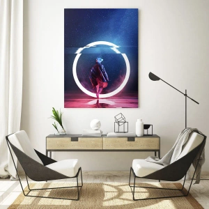 Glasbild - Bild auf glas - Eine Figur in futuristischem Setting mit Neonring - 50x70cm - Zwischen den Welten - Moderne Wanddekoration für Wohnzimmer und Schlafzimmer ARTTOR