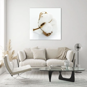 Glasbild - Bild auf glas - Eine einzelne flauschige Baumwollblume auf weißem Hintergrund - 50x70cm - Von Natur aus weich - Moderne Wanddekoration für Wohnzimmer und Schlafzimmer ARTTOR
