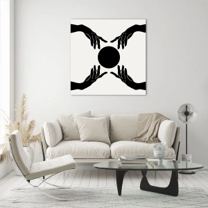 Das Motiv der Hände scheint ein universelles Symbol für Kontakt, Energie und spirituelle Kommunikation zu sein. Ihre Anordnung suggeriert Bewegung, Konzentration und Harmonie, was an Symbole des Gleichgewichts oder Rituals erinnern kann. Die schwarze Kugel in der Mitte kann einen Fokuspunkt, einen Zweck oder ein Geheimnis symbolisieren und lässt dem Betrachter viel Raum für Interpretationen. Diese Kunstform eignet sich perfekt für Räume, die Wert auf moderne Dekoration, künstlerischen Ausdruck und gewagtes Design legen.