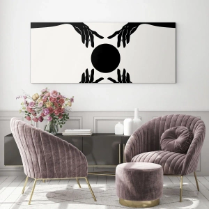 Glasbild - Bild auf glas - Schwarze Hände um einen schwarzen Kreis auf hellem Hintergrund - 70x50cm - Geheimes Zeichen - Moderne Wanddekoration für Wohnzimmer und Schlafzimmer ARTTOR