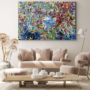Die Leinwand wird über den Rahmen gespannt. Die Seiten und Kanten werden gedruckt, um das Bild fortzusetzen. Das Bild ist fertig zum Aufhängen an der Wand. Jedes Produkt hat einen am Rahmen befestigten Anhänger und ein Montageset (Schraube + Stift).