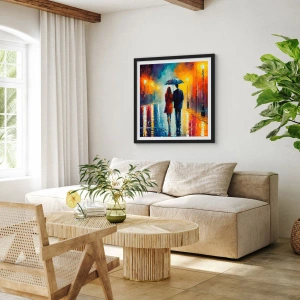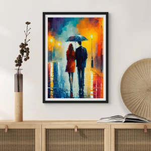 Poster in einem schwarzem Rahmen - Ein Paar unter einem Regenschirm, das durch eine farbenfrohe Nachtstadt spaziert - 70x50cm - Gemeinsam – eine bunte Nacht - Moderne Wanddekoration für Wohnzimmer und Schlafzimmer ARTTOR