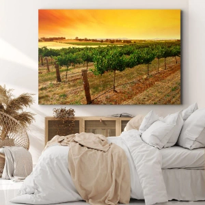 Bild auf Leinwand - Leinwandbild - Weinreben auf einer Plantage bei einem goldenen Sonnenuntergang - 140x50cm - Holen Sie sich einen Drink von der Sonne - Moderne Wanddekoration für Wohnzimmer und Schlafzimmer ARTTOR