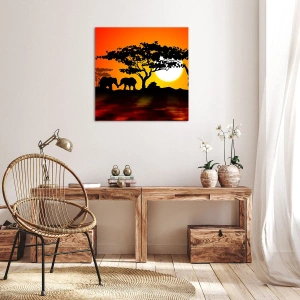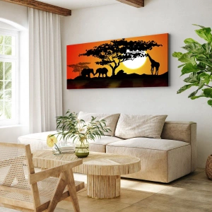 Bild auf Leinwand - Leinwandbild - Afrikanischer Sonnenuntergang mit Silhouetten von Elefanten und Giraffen über dem Wasser - 120x80cm - Treffen in der Savanne - Moderne Wanddekoration für Wohnzimmer und Schlafzimmer ARTTOR