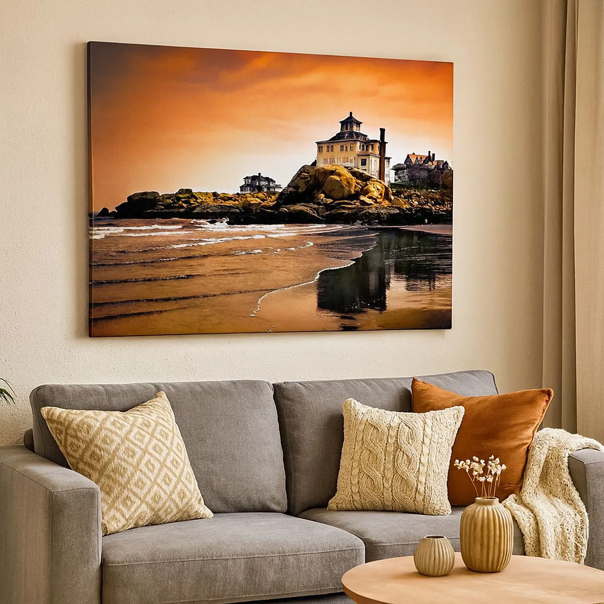 Bild auf Leinwand - Leinwandbild - Ein Haus auf einem Felsen am Strand bei Sonnenuntergang mit seiner Spiegelung im Wasser - 120x80cm - Eleganz der Westküste - Moderne Wanddekoration für Wohnzimmer und Schlafzimmer ARTTOR