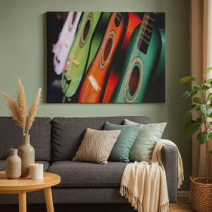 Bild auf Leinwand - Leinwandbild - Bunte Gitarren in verschiedenen Farbtönen in einer Reihe angeordnet - 140x50cm - Die Gitarre hat viele Farben - Moderne Wanddekoration für Wohnzimmer und Schlafzimmer ARTTOR