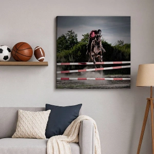 Bild auf Leinwand - Leinwandbild - Ein Reiter auf einem Pferd springt über ein Hindernis auf einer Rennbahn - 120x80cm - Gemeinsam zum Sieg - Moderne Wanddekoration für Wohnzimmer und Schlafzimmer ARTTOR