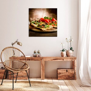 Das Leinwandbild "Direkt aus dem Ofen und aus dem Garten" ist ein einzigartiges Angebot für Liebhaber kulinarischer Motive in der Inneneinrichtung. Es zeigt eine frisch zubereitete Pizza mit knusprigem Teig, großzügig dekoriert mit Gemüse, Rucola und Oliven. Die Komposition wird auf einem Holzbrett serviert, was ihren rustikalen und natürlichen Charakter unterstreicht. Saftige Tomaten im Hintergrund sorgen für Farbe und ein appetitliches Aussehen.