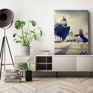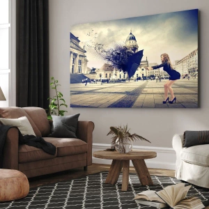 Bild auf Leinwand - Leinwandbild - Eine Frau mit Regenschirm in einer künstlerischen Komposition vor urbanem Hintergrund - 100x70cm - Es weht so ein Wind ... - Moderne Wanddekoration für Wohnzimmer und Schlafzimmer ARTTOR