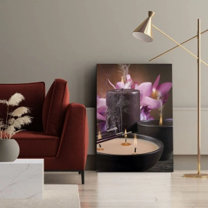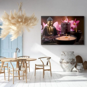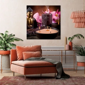 Dieses Gemälde ist eine ausgezeichnete Wahl für Liebhaber von Dekorationen, die von östlicher Kultur und Zen-Kunst inspiriert sind. Elemente wie eine Buddha-Figur, aromatische Räucherstäbchen und brennende Kerzen schaffen eine Komposition, die Harmonie und spirituelles Gleichgewicht in den Innenraum bringt.