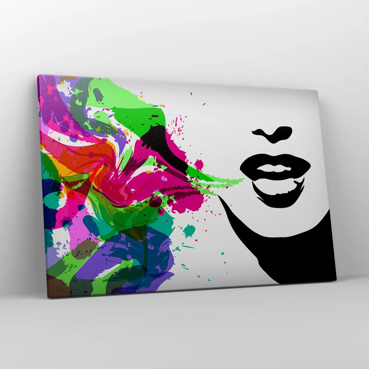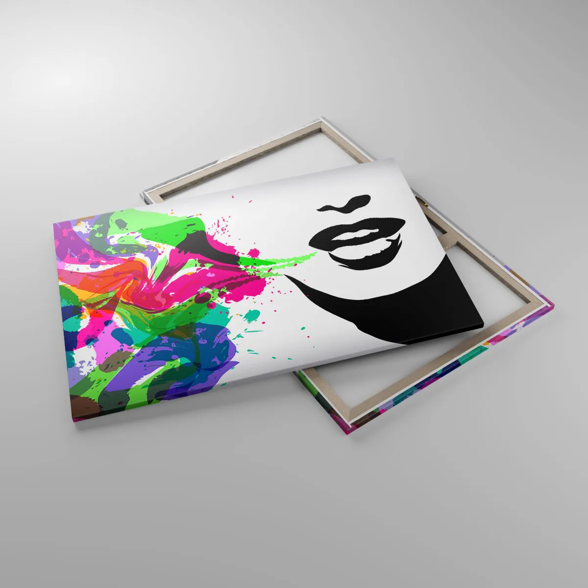 Die Leinwand wird über den Rahmen gespannt. Die Seiten und Kanten werden gedruckt, um das Bild fortzusetzen. Das Bild ist fertig zum Aufhängen an der Wand. Jedes Produkt hat einen am Rahmen befestigten Anhänger und ein Montageset (Schraube + Stift).