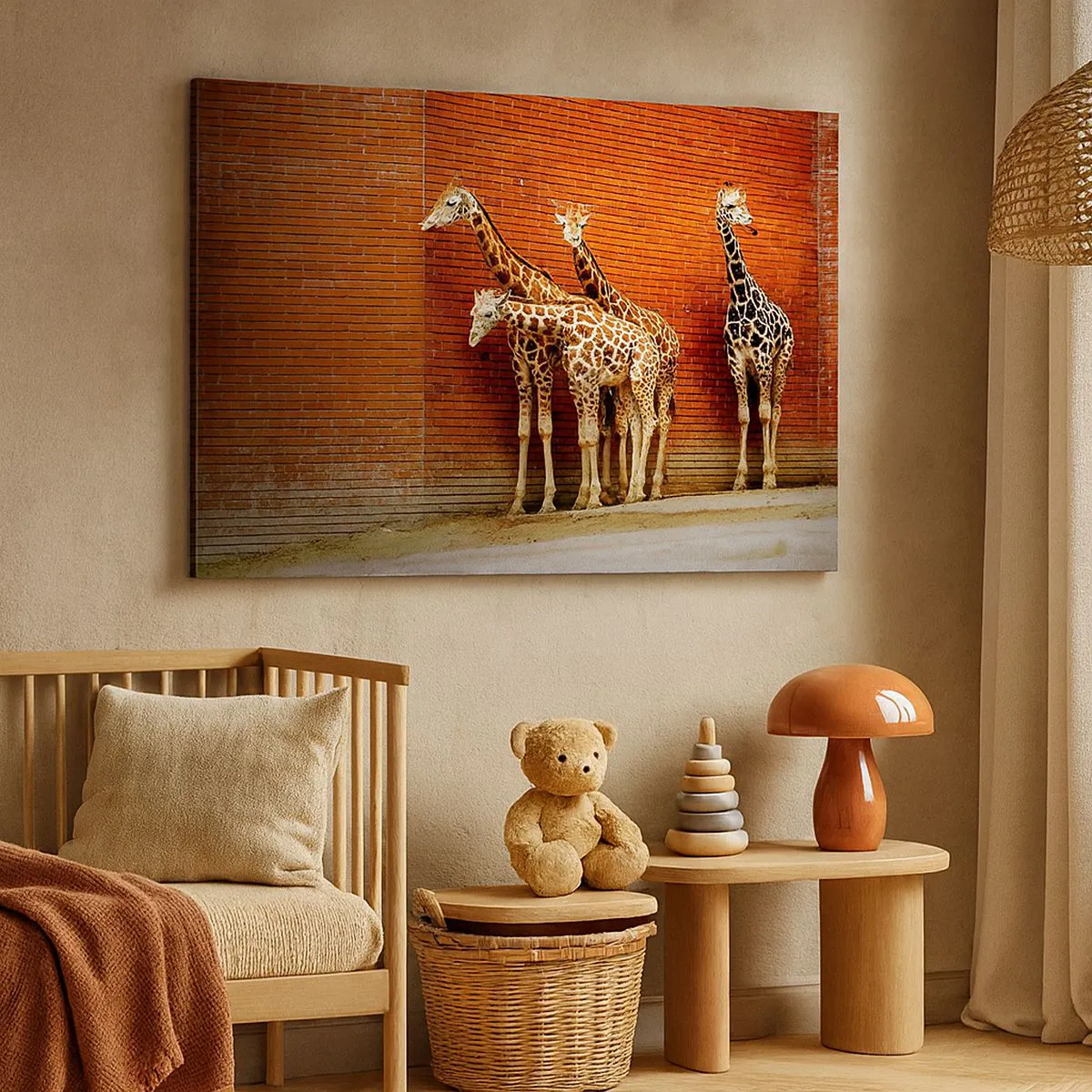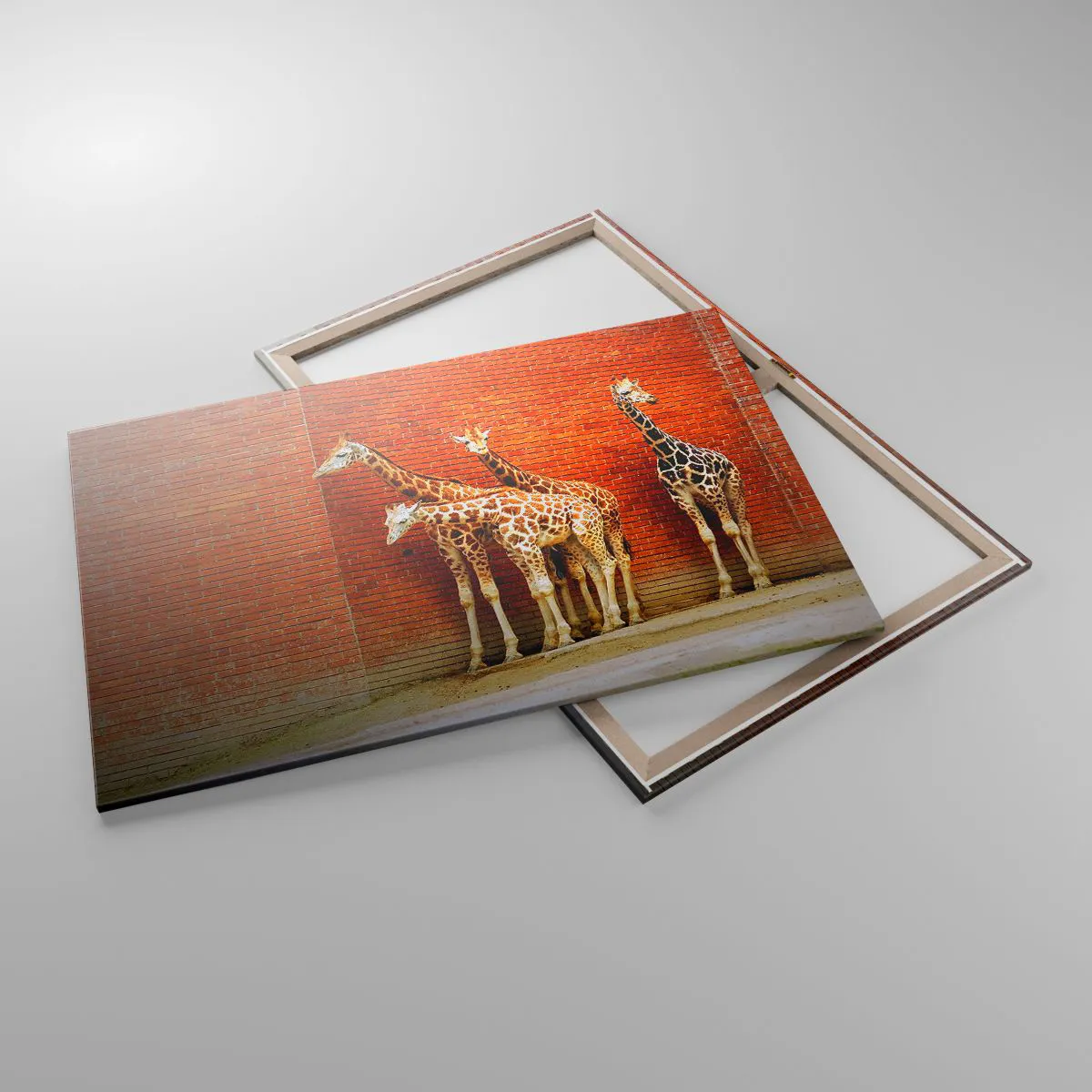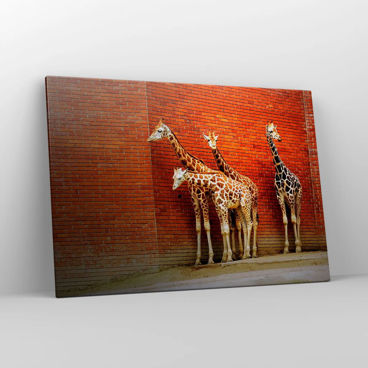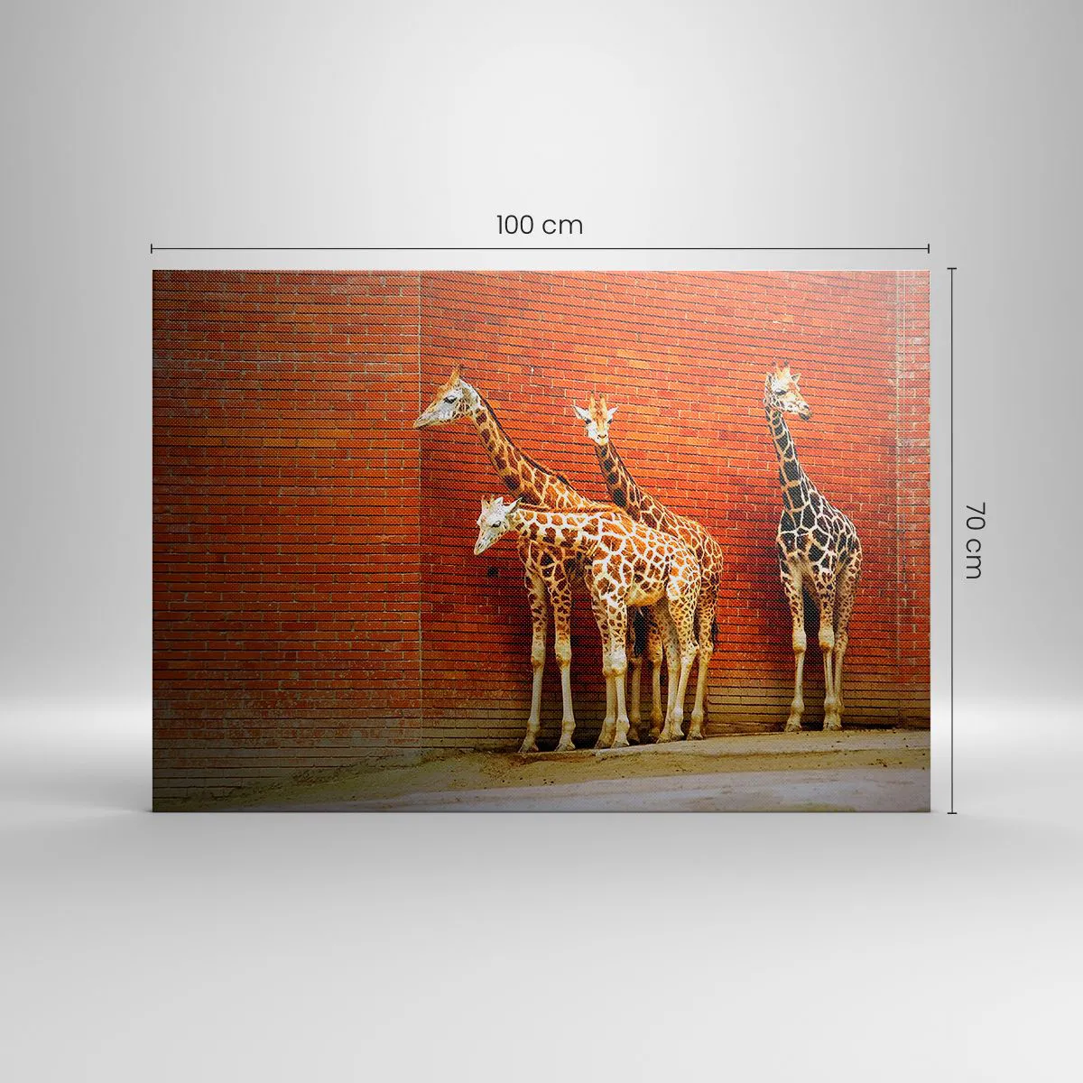 Bild auf Leinwand - Leinwandbild - Vier Giraffen vor einer Ziegelwand in künstlerischer Umgebung - 100x70cm - Sehen Sie Akazien? - Moderne Wanddekoration für Wohnzimmer und Schlafzimmer ARTTOR