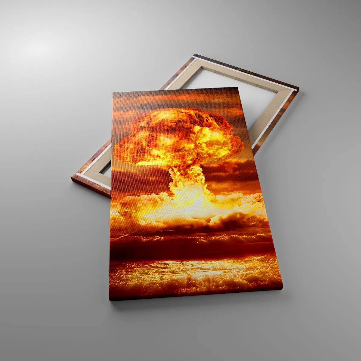 Die Leinwand wird über den Rahmen gespannt. Die Seiten und Kanten werden gedruckt, um das Bild fortzusetzen. Das Bild ist fertig zum Aufhängen an der Wand. Jedes Produkt hat einen am Rahmen befestigten Anhänger und ein Montageset (Schraube + Stift).
