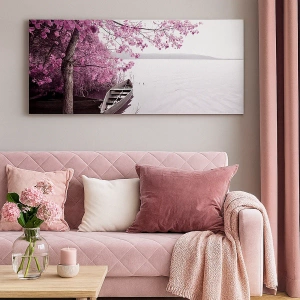 Bild auf Leinwand - Leinwandbild - Ein Boot am Ufer eines Sees zwischen rosa Bäumen - 70x50cm - In rosa Stille - Moderne Wanddekoration für Wohnzimmer und Schlafzimmer ARTTOR