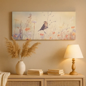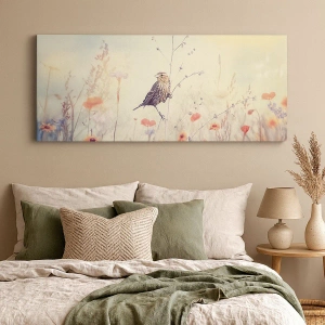 Bild auf Leinwand - Leinwandbild - Ein Vogel vor dem Hintergrund einer bunten Wiese in Pastellfarben - 100x70cm - Vogelporträt mit einer Wiese im Hintergrund - Moderne Wanddekoration für Wohnzimmer und Schlafzimmer ARTTOR