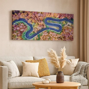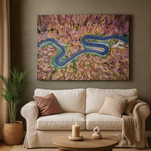 Bild auf Leinwand - Leinwandbild - Eine kurvenreiche Straße in einem herbstlichen Wald aus der Vogelperspektive gesehen - 100x70cm - Kurvenreicher Weg durch den Wald - Moderne Wanddekoration für Wohnzimmer und Schlafzimmer ARTTOR