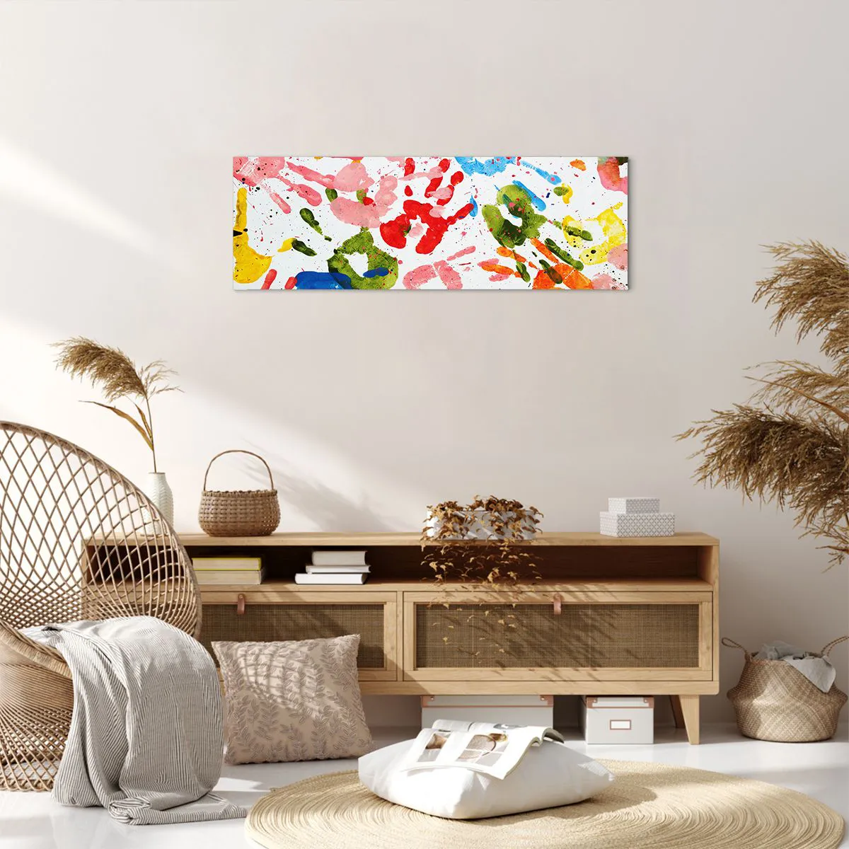 Wir verwenden ökologische, geruchslose und langlebige Tinten mit tiefer Farbsättigung. Durch moderne Drucktechnik wird der Druck präzise platziert, wobei die sichtbare Struktur der Leinwand erhalten bleibt