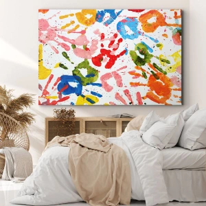 Die Leinwand wird über den Rahmen gespannt. Die Seiten und Kanten werden gedruckt, um das Bild fortzusetzen. Das Bild ist fertig zum Aufhängen an der Wand. Jedes Produkt hat einen am Rahmen befestigten Anhänger und ein Montageset (Schraube + Stift).