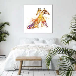 Dieses 70 x 50 cm große, horizontale Leinwandgemälde mit dem Titel „Ist das Freundschaft oder ist das Liebe?“ zeigt zwei Aquarell-Giraffen in intensiven, bunten Farbtönen. Die künstlerische Darstellung dieser majestätischen Tiere bringt eine fröhliche und inspirierende Atmosphäre in den Innenraum.