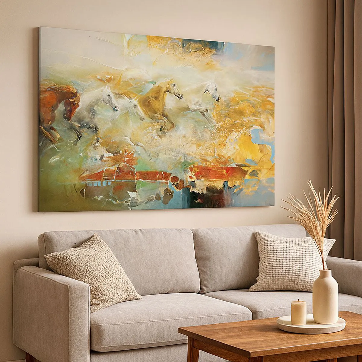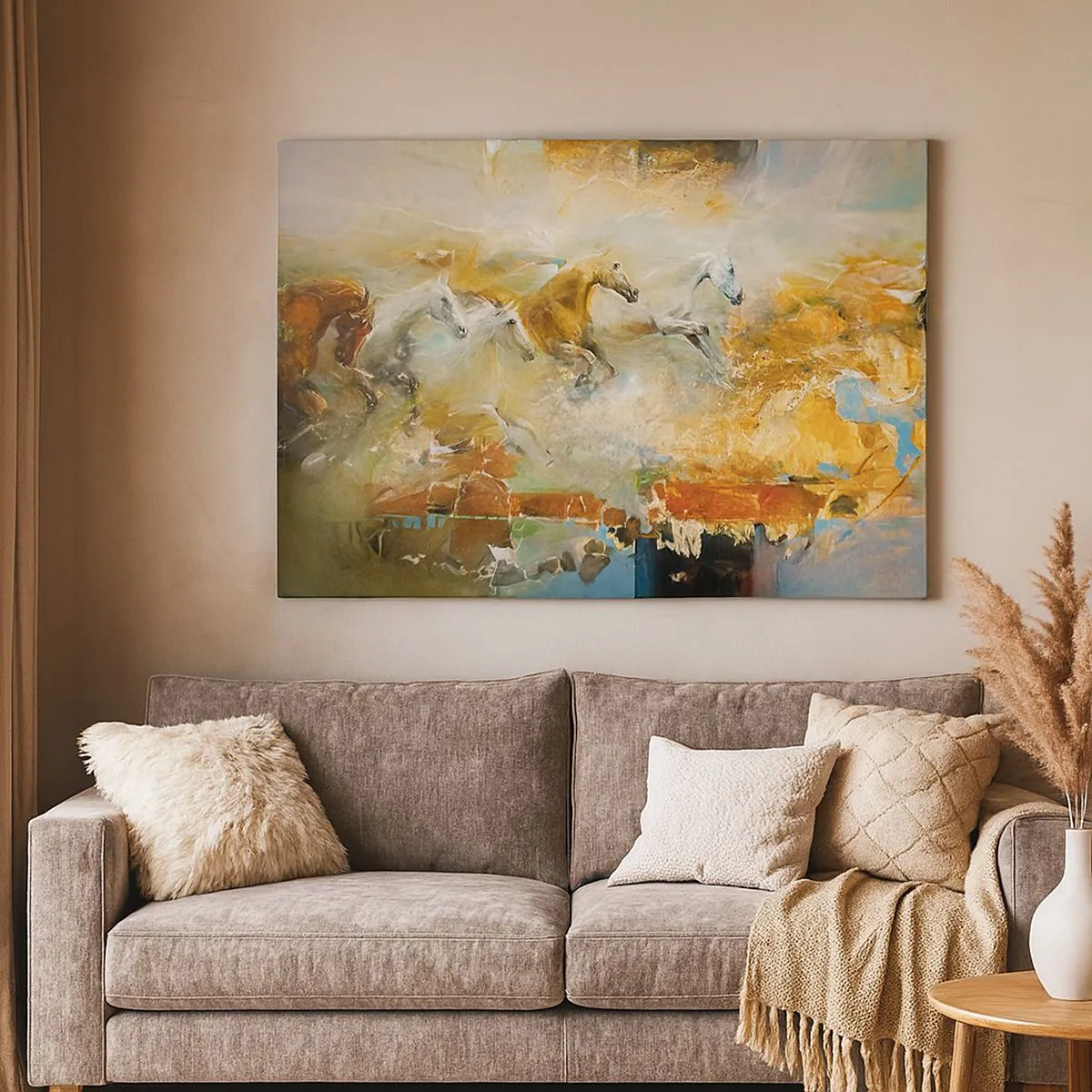 Dank seiner Abmessungen und des horizontalen Formats kann das Gemälde leicht an verschiedene Räume angepasst werden. Hochwertige Verarbeitung gewährleistet Langlebigkeit und leuchtende Farben, die viele Jahre lang begeistern werden. Die abstrakte Szenerie mit Pferden im Vordergrund verleiht dem Gemälde einen einzigartigen Charakter und macht es zu einem Blickfang im Interieur.