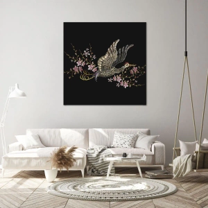 Bild auf Leinwand - Leinwandbild - Ein Vogel im Flug mit Blumen auf schwarzem Hintergrund - 70x50cm - Exotischer gestickter Vogel - Moderne Wanddekoration für Wohnzimmer und Schlafzimmer ARTTOR