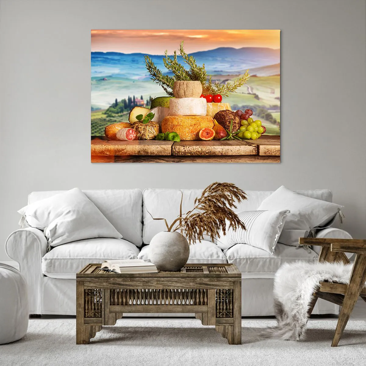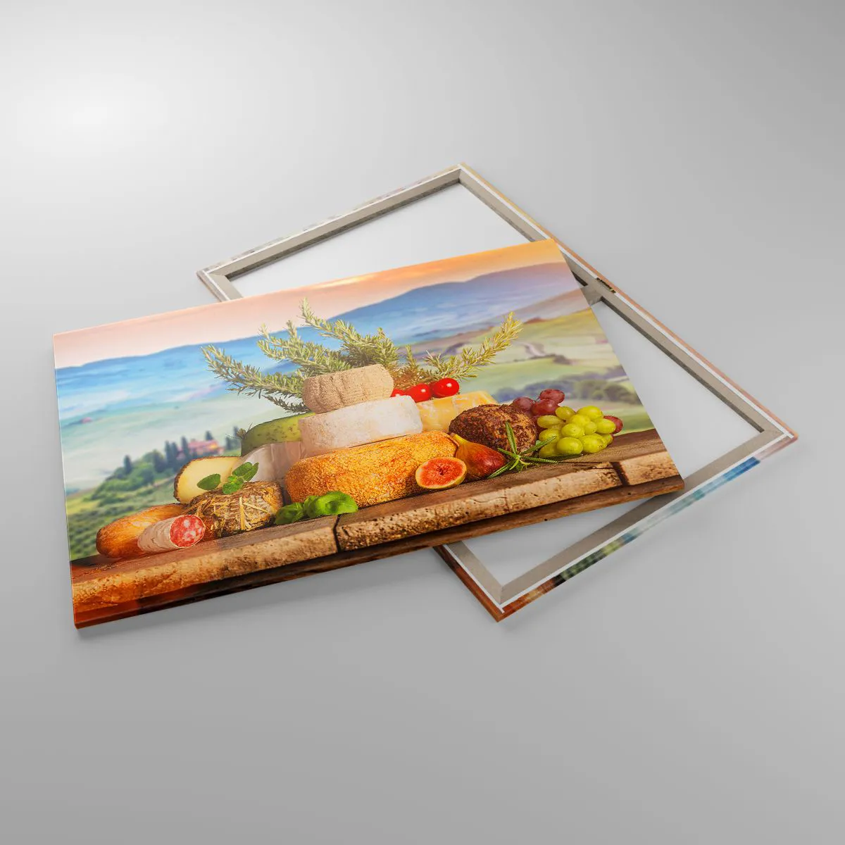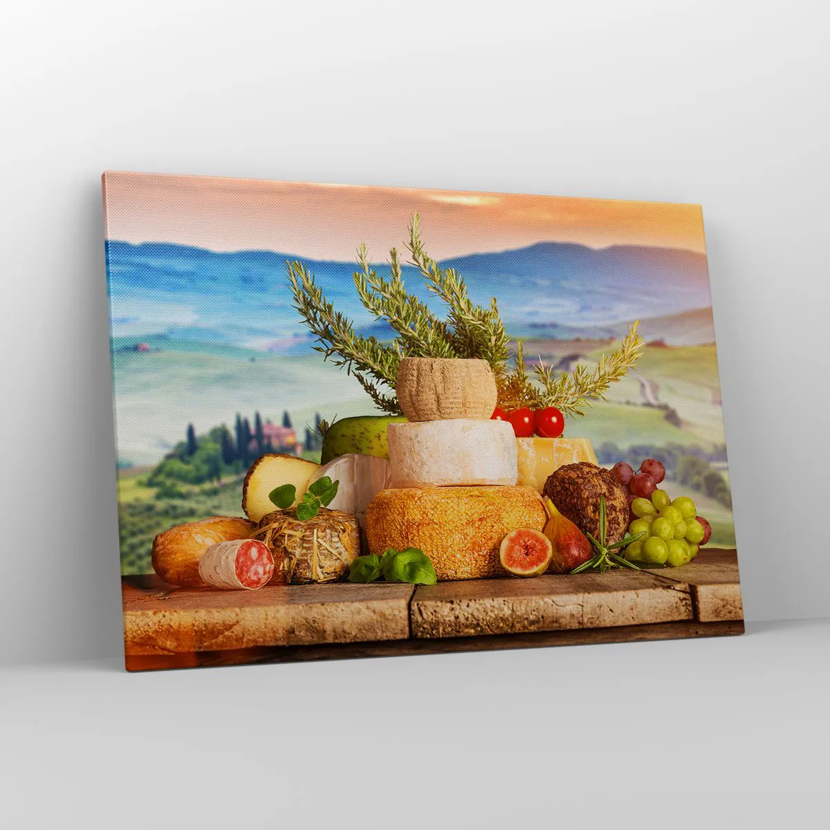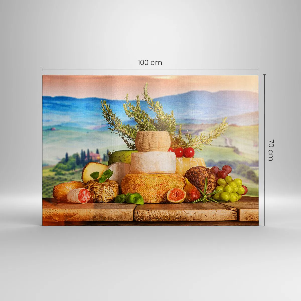 Bild auf Leinwand - Leinwandbild - Eine Komposition aus Käse und Früchten vor der Kulisse der toskanischen Landschaft - 100x70cm - Die italienische Lebensfreude - Moderne Wanddekoration für Wohnzimmer und Schlafzimmer ARTTOR