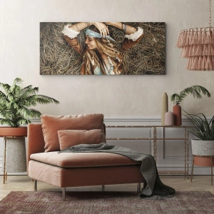 Bild auf Leinwand - Leinwandbild - Frau im Boho-Stil liegt auf Heu - 160x50cm - Auf dem Weg in den Sommer der Liebe - Moderne Wanddekoration für Wohnzimmer und Schlafzimmer ARTTOR