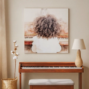 Bild auf Leinwand - Leinwandbild - Ein Mädchen mit buschigem Haar am Klavier - 70x50cm - In der neuen Welt - Moderne Wanddekoration für Wohnzimmer und Schlafzimmer ARTTOR