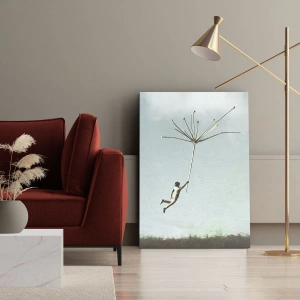 Bild auf Leinwand - Leinwandbild - Eine Figur, die von einem großen Löwenzahnsamen hochgehoben wird - 120x80cm - Drachen, Löwenzahn, Wind - Moderne Wanddekoration für Wohnzimmer und Schlafzimmer ARTTOR
